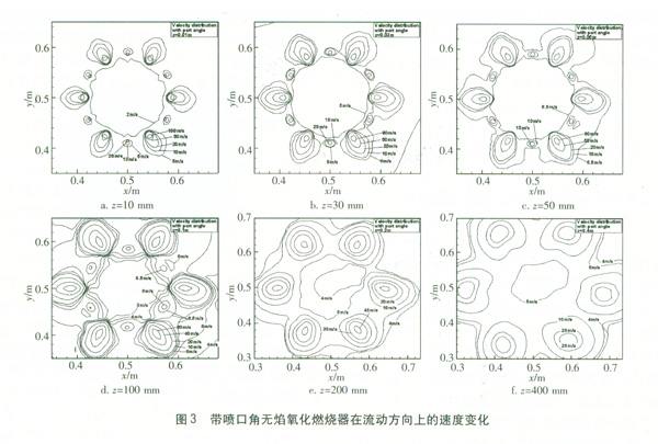 圖3顯示了該燃燒器在流動方向上的速度變化。圖中2表示沿燃燒器軸心線方向,即燃料和空氣從燃燒器中噴出的主流動方向,z=0為燃燒器表面。由圖3可知,在z=100 mm之前,燃燒器的燃料射流和空氣射流能保持相對獨立的結構,然而沿流動方向繼續(xù)向前,燃料射流被卷吸進入空氣射流之中,同時空氣射流核心的最大速度也從z=10 mm處的100 m/s降低到z=400 mm處的25 m/s,弱射流被周圍的強射流卷吸的結果可南文獻[11]的分析解所證實。當射流卷吸附近的氣流時,較高的速度朝空氣和燃料射流環(huán)的內側擴展,射流環(huán)內部的氣流速度從z=10 mm(1處的0~1 m/s增加到z=200mm處的4~5 m/s。另一方面,與空氣射流環(huán)內部的氣體流動一樣,射流環(huán)外側的氣流速度也隨流動方向增加。燃料射流環(huán)在z=400 mm左右消失。