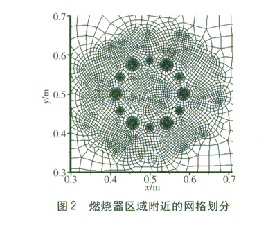 數值求解的精度與網格的類型和密度緊密相關。本研究中燃料口和空氣口的尺寸與整個爐膛的尺寸相比很小,由于在燃燒器內同時進行著流動、傳熱和化學反應,因此在此附近區(qū)域的熱力參數變化激烈,此區(qū)域的網格必須有更小的尺寸以適應參量的劇烈變化。圖2為主流方向某個面上燃燒器附近區(qū)域的網格劃分。