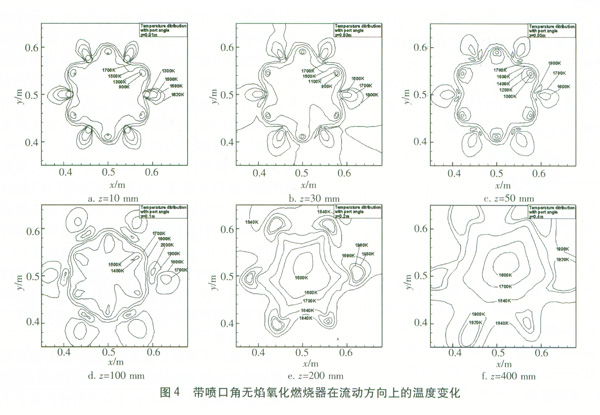 圖4給出了帶噴口角無焰氧化燃燒器溫度沿燃燒器軸線方向的變化情況。從圖4a可看出,燃燒器區(qū)域的最高溫度1 700 K位于空氣射流的某個半徑處,這表示空氣射流卷吸其附近的天然氣和燃燒產物使氧化劑、燃料和產物的比例在該空氣射流半徑處達到最佳的狀態(tài)。燃燒首先在那里發(fā)生,朝空氣射流中心的周圍擴散。當流動進一步向下游推進時,燃燒強度進一步增加,溫度逐漸上升,最高溫度大約出現在z=100 mm處。在z=100mm之后,由于燃料大部分被燃燒,溫度又開始逐漸降低,并且由于混合更充分,溫度也變得更均勻。另外,由于噴嘴沿軸心具有向外的傾角,沿著軸線方向射流問的間隔也變得越大(即從射流整體運動來看,它像一個圓錐擴展運動,因此沿著石方向,即圓錐軸線方向,在圓錐橫截面上的各分射流間隔越來越大),在空氣射流和燃料射流混合之前,它們更充分地被燃燒產物所稀釋,燃燒區(qū)域更大,因此最高溫度也較低。