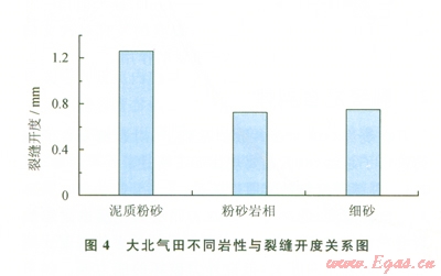 大北單井平均裂縫開(kāi)度統(tǒng)計(jì)結(jié)果表明,在泥質(zhì)粉砂巖中裂縫開(kāi)度最大,平均開(kāi)度大于l
