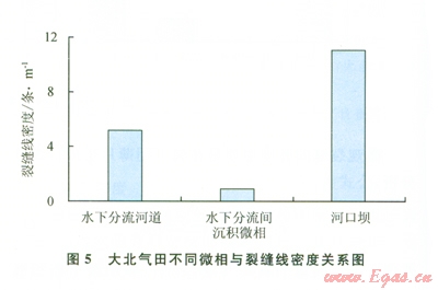 而根據(jù)單井統(tǒng)計(jì)的裂縫線密度與沉積微相的關(guān)系圖表明:河口壩平均裂縫線密度為11條/m,平均裂縫線密度最大,裂縫最發(fā)育;水下分流河道微相平均裂縫線密度為5條/m;分流間灣裂縫最不發(fā)育,平均線密度只有不到1條/m(圖5)。