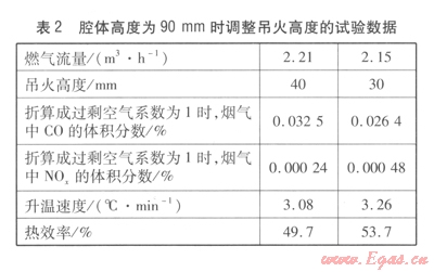 吊火高度過低則排煙不暢,影響一次空氣的引入而導(dǎo)致煙氣中的C0含量偏高;吊火高度過高,煙氣中的C0含量雖然低,但影響了熱效率。因此,在保證煙氣中C0含量達(dá)到相關(guān)標(biāo)準(zhǔn)的前提下,應(yīng)盡可能降低吊火高度。經(jīng)試驗(yàn)得出,吊火高度取30~40 mm比較合適。