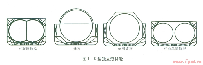 對(duì)于圖l所示的幾種C型獨(dú)立液貨艙,在貨物滿載時(shí),球型和單圓筒型液貨艙的重心比雙聯(lián)圓筒型液貨艙高,故降低了船的穩(wěn)性,且由于球型和單圓筒型液貨艙直徑大,部分體積凸出主甲板以上,故增加了受風(fēng)面積,不利于操縱。就船體主甲板以下的艙容利用率而言,雙聯(lián)圓筒型液貨艙最高,單圓筒型液貨艙次之,雙排單圓筒型液貨艙最差。在同樣的船體主尺寸下,如采用雙排單圓筒型液貨艙,需要增加船寬以滿足布置要求。
