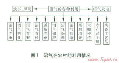 截至2009年底,全國(guó)農(nóng)村戶用沼氣池累計(jì)達(dá)3 507×104座,年產(chǎn)沼氣l24×108 m3。預(yù)計(jì)到2020年,約3×108戶農(nóng)村居民的生活燃?xì)庵饕钦託?,年沼氣利用量約為300×108 m3[2]。同時(shí),各地還因地制宜地整合太陽(yáng)能、沼氣技術(shù)以及種植業(yè)、養(yǎng)殖業(yè)的產(chǎn)業(yè)結(jié)構(gòu),實(shí)踐性地探索出一系列適合中國(guó)農(nóng)村地區(qū)推廣應(yīng)用的小規(guī)模庭院式能源生態(tài)模式[3]。具有代表意義的是北方農(nóng)村能源生態(tài)模式(四位一體”)和南方--模式。沼氣為農(nóng)戶解決炊事、照明等生活用能的同時(shí),還帶動(dòng)了農(nóng)副產(chǎn)品生產(chǎn)、加工的發(fā)展。沼氣在農(nóng)村的利用情況見(jiàn)圖1[4]。
