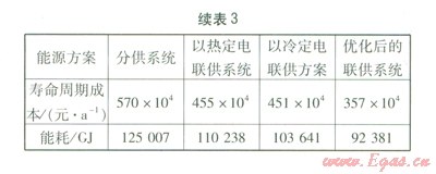 以熱定電聯(lián)供方案按照吸收式機組供熱量與熱負荷之比確定。經(jīng)模型優(yōu)化后,當聯(lián)供系統(tǒng)壽命周期成本最小時,吸收式機組供熱量與熱負荷之比為0.4,即以熱定電聯(lián)供方案中吸收式機組的供熱量確定為熱負荷的40%,再根據(jù)吸收式機組的制熱性能系數(shù)確定所需熱量,從而確定以熱定電聯(lián)供系統(tǒng)的配置方案。以冷定電聯(lián)供方案的確定與以熱定電聯(lián)供系統(tǒng)方法基本一致,區(qū)別在于,經(jīng)模型優(yōu)化后,當聯(lián)供系統(tǒng)壽命周期成本最小時,吸收式機組的供冷量與冷負荷之比為0.3。由表3可知,優(yōu)化后的聯(lián)供系統(tǒng)壽命周期成本及能耗最低,這表明優(yōu)化后的聯(lián)供系統(tǒng)在經(jīng)濟性及節(jié)能方面均具有一定優(yōu)勢。
