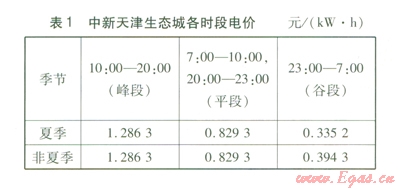 燃氣價格按照2.4 元/m3計算,中新天津生態(tài)城各時段電價見表l。此外,燃氣輪機部分負荷率下降到0.5以下時熱效率下降嚴重,因此將燃氣輪機部分負荷率≥0.5作為約束條件。將以上參數(shù)輸入到優(yōu)化評價模型就可得到聯(lián)供系統(tǒng)的最優(yōu)設備配置和運行策略。