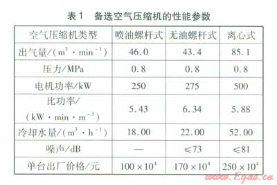根據(jù)上述要求,可綜合選用噴油螺桿式空氣壓縮機、無油螺桿式空氣壓縮機、離心式空氣壓縮機。參考廠家的樣本資料,備選空氣壓縮機的性能參數(shù)見表l。