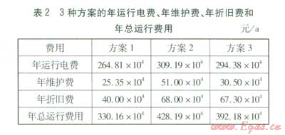 根據(jù)式(1)~(4)得出3種方案的年運行電費、年維護費、年折舊費和年總運行費用,見表2。