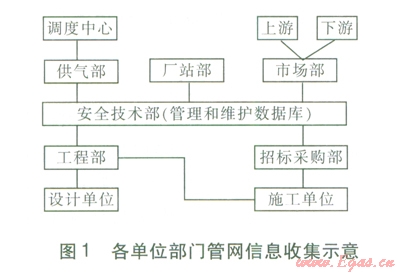 燃氣公司中與城鎮(zhèn)燃氣管網(wǎng)基礎信息數(shù)據(jù)庫管理直接相關的部門包括安全技術部、供氣部、廠站部、市場部、工程部、招標采購部。安全技術部主要負責向工程部和供氣部提供安全運行、管理、維護方面的技術支持;風險評價工作由安全技術部開展。供氣部主要負責城市輸配管網(wǎng)的安全運行,巡線、事故搶修,供氣部的調(diào)度中心負責管網(wǎng)及廠站運行信息的采集和分析,并發(fā)布指令。廠站部主要負責廠站的日常運行和維護。市場部主要負責向上游購氣,并將燃氣銷售給下游的用戶。工程部主要負責與設計單位交流,提出設計要求,并收集設計方面的信息。招標采購部主要負責招標設計單位和施工單位,采購施工設備及材料。
