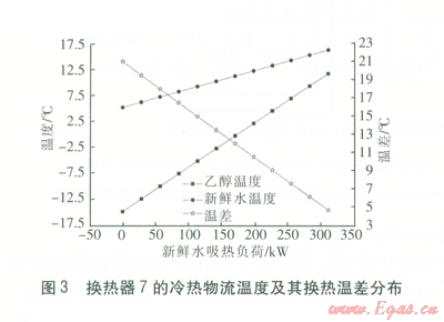 由圖3可知,-l5℃的乙醇與16℃的新鮮水進行熱交換時,乙醇升溫至ll℃吸收了312 kW左右的熱流量,新鮮水被冷卻至5℃。
