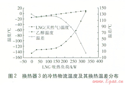 由圖2可知,當(dāng)-145℃LNG與乙醇進行熱交換時,LNG氣化升溫至6℃吸收的熱流量為325kW11℃的乙醇降溫至-l5℃,放出相同的熱流量,溫度降低了26℃。