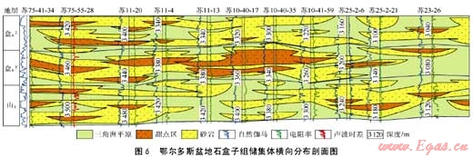 ②儲集體物性與連續(xù)性橫向變化。這是由于沉積環(huán)境、成巖作用與后生改造作用強(qiáng)度的橫向變化,使儲集體在總體連續(xù)且大型化發(fā)育的背景上,其內(nèi)部存在儲集空間與物性的橫向規(guī)模變化,因而在似層狀分布背景上,形成了由一系列孔、滲和孔喉結(jié)構(gòu)相對較好的儲滲單元或縫洞單元組成的儲集體群,單個(gè)儲滲單元和縫洞單元的規(guī)模不大,且尺度多變,但形成的儲集體群的規(guī)模相當(dāng)大。如鄂爾多斯盆地蘇里格氣田的砂巖儲集層,主要由眾多致密砂體和常規(guī)砂體組成(見圖6)。