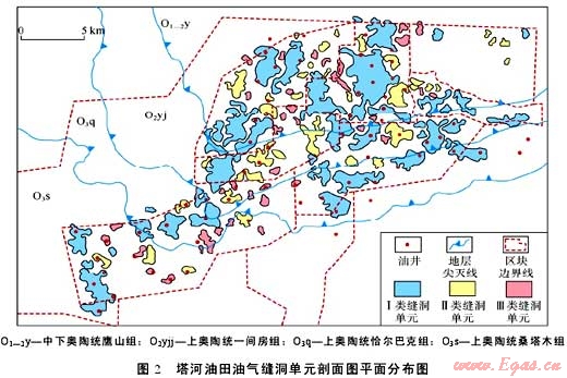大型化成藏包含兩方面含義:①成藏要素的大型化發(fā)育與平面上的規(guī)模變化。從成藏要素看,烴源灶、儲集體以及生儲蓋組合的分布面積至少在數(shù)千甚至上萬平方千米以上,如鄂爾多斯盆地上古生界石炭系煤系烴源巖與二疊系碎屑巖儲集層,分布面積都超過20×104km2。從成藏要素的規(guī)模變化看,烴源灶、儲集體的平面分布存在強(qiáng)烈的非均勻性,致使形成的地層和巖性圈閉在橫向上具有多變性,呈集群式分布。如塔里木盆地輪南—塔河奧陶系碳酸鹽巖縫洞型大油氣田,可以劃分出數(shù)百個(gè)縫洞單元,每個(gè)縫洞單元都是一個(gè)相對獨(dú)立的油氣聚集單元,形成的油氣藏呈集群式分布(見圖2)。②成藏分布樣式上表現(xiàn)為薄餅式或集群式成藏,這是中低豐度油氣藏群區(qū)別于常規(guī)高豐度油氣藏(田)和非常規(guī)連續(xù)型油氣聚集最典型的特征。