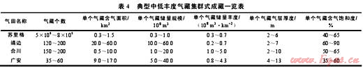 集群式成藏是指油氣在一系列呈集群式發(fā)育的地層、巖性圈閉中聚集而形成的一類成藏現(xiàn)象。這是由于在克拉通盆地平緩臺地區(qū)的碳酸鹽巖層系、陸內(nèi)坳陷海陸過渡相與陸相層系以及前陸盆地緩翼廣大斜坡區(qū)的陸相沉積層系中,因建設(shè)性成巖和后生成巖改造作用,或由于原始沉積物源區(qū)巖性多變、水動力能量多變等,導(dǎo)致儲集層非均質(zhì)性強(qiáng),形成眾多呈獨(dú)立或半獨(dú)立狀分布的聚集體,就像玻璃板中眾多大小不一的氣泡,單體規(guī)模不大,但儲集體眾多則形成了規(guī)模巨大的集合體(見表4)。當(dāng)油氣充注后,不僅形成的油氣藏群規(guī)模很大,而且這些規(guī)模巨大的油氣藏群對封蓋條件的要求也不高,只要有遮擋條件(多數(shù)小于幾個(gè)兆帕)就可規(guī)模成藏,其中豐度較高的油氣藏(俗稱“甜點(diǎn)”)是油氣勘探的重點(diǎn)。如鄂爾多斯盆地蘇里格氣田盒8段心灘砂體,由于巖性、物性橫向變化劇烈,致使大氣田由成千上萬個(gè)單體規(guī)模較小的氣藏群構(gòu)成,常規(guī)小型巖性氣藏之間連續(xù)或不連續(xù)分布著含氣飽和度較低的致密氣層、干層或水層(蘇里格西區(qū)低部位),總體表現(xiàn)為非常規(guī)氣與常規(guī)氣的混合共生。根據(jù)對蘇里格氣田的解剖,氣田的含氣面積接近3.3×104km2,依據(jù)砂體形態(tài)可以確定的氣藏?cái)?shù)量約5×104~8×104個(gè),單個(gè)氣藏氣柱高度2~6m、儲量規(guī)模一般在3000×104~10000×104m3,整個(gè)氣田的平均儲量豐度約0.7×108m3/km2。致密砂巖普遍含氣,含氣飽和度不高但連續(xù)分布。