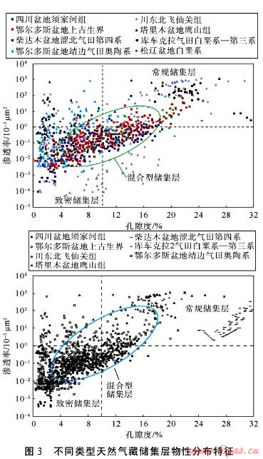 根據(jù)對已發(fā)現(xiàn)油氣藏地質(zhì)特征的分析,中國油氣資源目前可以劃分為3大類:①常規(guī)油氣資源,以已發(fā)現(xiàn)的高豐度油氣田(藏)為代表;②非常規(guī)油氣資源,包括部分致密砂巖氣、致密油、煤層氣和頁巖氣等,也可稱之為連續(xù)型油氣聚集;③混合型油氣資源,由常規(guī)和非常規(guī)油氣資源混合而成,在地質(zhì)含義上等同于中低豐度油氣藏群?;旌闲陀蜌赓Y源有3方面特點(diǎn):①儲集體物性和儲集層結(jié)構(gòu)特征處于常規(guī)儲集層和非常規(guī)儲集層的過渡區(qū),具明顯的混合性(見圖3)。②油氣成藏存在兩種機(jī)制,既有常規(guī)油氣藏主要通過達(dá)西流動,以體積流方式成藏;也有非常規(guī)油氣(主要是致密砂巖油氣),主要通過非達(dá)西流動,以擴(kuò)散流方式成藏,成藏機(jī)制具有雙重性。③資源構(gòu)成具有二元性。若以儲集層地下滲透率小于0.1×103μm2、地面滲透率小于1×103μm2為標(biāo)準(zhǔn),統(tǒng)計(jì)中國陸上已發(fā)現(xiàn)的中低豐度(亦稱低滲透)天然氣儲量,常規(guī)氣約占35%,非常規(guī)氣約占65%。