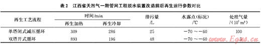 干燥器基本參數(shù)為:單塔分子篩質(zhì)量450kg,設計處理量10000m3/h,設計吸附周期16h。為量化分析工藝改造前后生產(chǎn)參數(shù)的變化(表2),依據(jù)文獻[4],將國家規(guī)定標況下壓縮天然氣的水露點-60℃換算成工況(3.6MPa)下的水露點為-30℃。