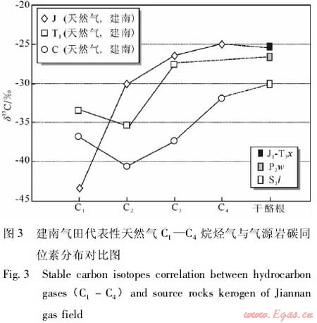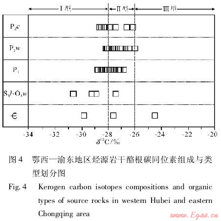 (3)本區(qū)長興組和飛仙關(guān)組天然氣的氣源巖主要為二疊系吳家坪組(P2w)烴源巖,且以Ⅱ型有機(jī)質(zhì)為主,能夠生成大量的原油,具備原油裂解作用發(fā)生的物質(zhì)基礎(chǔ)。對于本區(qū)高成熟度的天然氣而言,利用同位素資料進(jìn)行氣—巖對比是比較可靠的方法。本區(qū)侏羅系和石炭系天然氣的丁烷碳同位素分別為-25.0‰和-31.9‰,而三疊系天然氣丁烷的含量低,只測得丙烷碳同位素為-27.6‰,下志留統(tǒng)龍馬溪組(S1l)、吳家坪組(P2w)和侏羅系源巖干酪根的碳同位素均值分別為-30.0‰、-27.0‰和-25.5‰(圖3)。有研究表明,具有氣源關(guān)系的烴源巖的干酪根碳同位素比天然氣丁烷的碳同位素要重1.0‰左右[15]。根據(jù)這種對應(yīng)關(guān)系,侏羅系、三疊系飛仙關(guān)組和石炭系的天然氣應(yīng)該分別來源于侏羅系、二疊系吳家坪組和志留系龍馬溪組烴源巖(圖3)。從生儲配置關(guān)系來看,飛三段與上覆侏羅系之間有較厚的隔層,其氣源也不可能來自于侏羅系烴源巖;并且飛三段天然氣的碳同位素組成明顯重于石炭系天然氣(圖3),其不可能與石炭系天然氣具有相同的氣源巖。對于本區(qū)高過成熟的二疊系烴源巖(Ro均值為2.2%)而言,其有機(jī)質(zhì)類型用常規(guī)熱解和元素組成數(shù)據(jù)很難判斷[16],比較可靠的方法是利用源巖干酪根碳同位素數(shù)據(jù)進(jìn)行分析。本區(qū)二疊系吳家坪組烴源巖的干酪根碳同位素值為-26.0‰~-28.2‰,與Ⅱ型有機(jī)質(zhì)具有較好的對應(yīng)關(guān)系;志留系烴源巖的干酪根碳同位素在-27.0‰~-31.0‰,主要為Ⅰ型有機(jī)質(zhì);寒武系烴源巖的干酪根碳同位素比較分散,類型可能比較復(fù)雜(圖4)。根據(jù)上述分析,本區(qū)吳家坪組烴源巖有機(jī)質(zhì)類型主要為Ⅱ型,以生油為主。