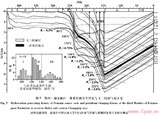飛三段油氣充注史主要根據(jù)飛三段儲層與烴類包裹體伴生的鹽水包裹體的均一溫度與儲層埋藏?zé)崾反_定。通過鏡下觀察,發(fā)現(xiàn)本區(qū)飛三段儲層膠結(jié)物中可見較多瀝青包裹體和天然氣包裹體,以及少量油包裹體。據(jù)前人研究,瀝青包裹體為油包裹體經(jīng)歷高溫之后的殘留產(chǎn)物[19],因此,可測定與瀝青包裹體伴生的鹽水包裹體的均一溫度代表古原油充注時的溫度。均一溫度的測定與統(tǒng)計(jì)結(jié)果(圖5):與瀝青包裹體伴生的鹽水包裹體的均一溫度在90~120℃;與天然氣和少量瀝青包裹體伴生的鹽水包裹體的均一溫度在120~140℃;與天然氣包裹體伴生的鹽水包裹體的均一溫度在140~180℃。把這3期均一溫度投影到地層埋藏史圖上(圖5),可知第Ⅰ期和第Ⅱ期大致與二疊系烴源巖的生油期相對應(yīng),而第Ⅲ期與烴源巖的生氣階段對應(yīng)。因此,認(rèn)為飛三段在侏羅紀(jì)主要發(fā)生了3期油氣充注:第Ⅰ期主要為原油充注;第Ⅱ期為原油充注,伴有天然氣充注;第Ⅲ期主要為天然氣充注。第Ⅲ期的天然氣充注,可能主要與儲層古原油裂解產(chǎn)生的天然氣有關(guān)。根據(jù)前人研究成果,認(rèn)為150℃是原油穩(wěn)定存在的上限溫度[20],而飛三段儲層在晚侏羅世的最高溫度接近180℃,表明具備原油裂解作用發(fā)生的溫度條件,飛三段古油藏在晚侏羅世基本全部裂解成氣藏。原油裂解作用發(fā)生的時間與第Ⅲ期天然氣充注的時間吻合,進(jìn)一步證明儲層中發(fā)生了原油裂解作用。