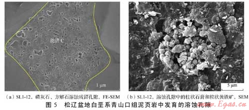 摘 要:為了查明泥頁巖系統(tǒng)微觀孔隙發(fā)育特征及其油氣地質(zhì)意義,利用掃描電鏡及場發(fā)射掃描電鏡二次電子成像技術對松遼盆地白堊系青山口組一段泥頁巖中的微觀孔隙進行了系統(tǒng)觀察。該套泥頁巖中主要發(fā)育了5種類型孔隙,即基質(zhì)晶間孔、有機質(zhì)孔、溶蝕孔、粒間孔、晶內(nèi)孔;此外,還發(fā)育大量微米—亞微米級(納米級)微裂縫,包括溶蝕縫、充填縫及層間縫3類。微孔隙和微裂縫構成復雜微裂縫網(wǎng)絡-孔隙系統(tǒng),為烴源巖生成的油氣向外排驅(qū)提供了有效通道,同時也為殘留在頁巖中的油氣提供了充分的儲集空間,對于油氣的初次運移以及頁巖油氣等非常規(guī)資源的儲集具有重要意義。