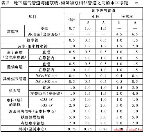 城鎮(zhèn)燃?xì)夤艿缐毫Ψ旨壖暗叵氯細(xì)夤艿琅c建筑物、構(gòu)筑物或相鄰管道之間水平凈距分別見表1,表2。