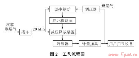 2) 熱水循環(huán)系統(tǒng)。熱水循環(huán)系統(tǒng)的主要設(shè)備是熱水鍋爐、熱水泵、電子水處理器、除污器等,負(fù)責(zé)向 CNG 減壓釋放裝置中的換熱設(shè)備提供循環(huán)熱水以保證系統(tǒng)的正常工作。調(diào)壓后的煤層氣作為熱水鍋爐的燃料。