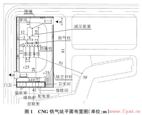 1) 站址的選擇。根據(jù) GB 50028-2006 第 7.3.1的要求,CNG供氣站站址選擇應(yīng)符合:
