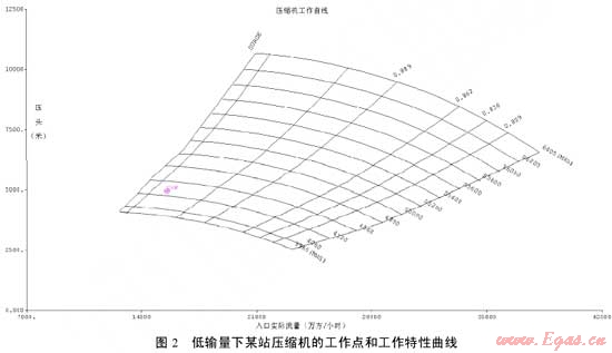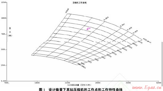 目前國內(nèi)已經(jīng)可以利用水力仿真軟件SPS模擬壓縮機工作曲線,完成壓縮機組的適用性分析。從不同輸量條件下某站壓縮機的工作點和工作特性曲線(圖2、圖3)明顯可見管道的水力工作點、壓縮機喘振曲線、堵塞曲線,最高轉速曲線、最低轉速曲線、效率曲線、不同轉速的揚程曲線。