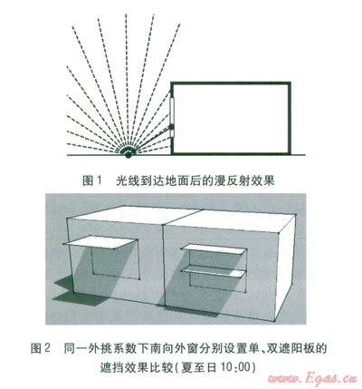 室內(nèi)的采光和視野。同一外挑系數(shù)下南向外窗分別設(shè)置單、雙遮陽(yáng)板的遮擋效果比較(夏至日10:O0)見圖2。由圖2可知,設(shè)置雙遮陽(yáng)板也能加強(qiáng)對(duì)直射光的遮擋。當(dāng)直射光從非正南入射時(shí),第二遮陽(yáng)板能夠有效地削弱進(jìn)入室內(nèi)的太陽(yáng)直射光,并且能將投射到下遮陽(yáng)板的直射光以漫反射的形式投射到室內(nèi)深處,加強(qiáng)室內(nèi)深處的采光效果。