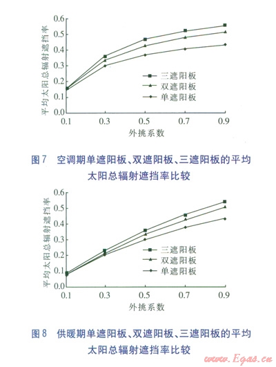 ②在相同外挑系數(shù)下,多遮陽(yáng)板的遮擋效果優(yōu)于單遮陽(yáng)板。