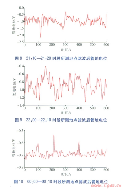 由各時段管地電位變化可得,軌道交通運行期間管地電位存在很大波動,圖2為軌道交通正常運行期間機車通過測試點時管地電位變化,電位波動有明顯峰值,極大值與極小值分別為0 V、-2.5 V; 圖4為單列運行期間無機車通過測試點時管地電位變化,由于其他位置通過機車電流的影響,管地電位仍有明顯波動,但幅值較機車通過時刻有所減??;圖6中軌道交通停運后,管地電位波動明顯減小,但高頻采集數(shù)據(jù)中存在干擾信號,數(shù)據(jù)頻繁對稱波動,需要進行濾波處理。所測結果表明所測地段燃氣管道受到雜散電流干擾,且雜散電流的產(chǎn)生與軌道交通運行有直接關系。