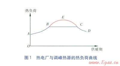 熱電廠與峰荷熱源的熱負(fù)荷曲線見圖l。由圖1可知,從供暖期開始至供暖期結(jié)束,基本熱負(fù)荷曲線為ABCD,當(dāng)進入嚴(yán)寒期,峰荷熱源投入運行,尖峰熱負(fù)荷曲線為BEC。采用圖l的熱負(fù)荷曲線運行,熱電廠從供暖期開始至結(jié)束,承擔(dān)的熱負(fù)荷比較平穩(wěn)。若尖峰熱負(fù)荷由熱電機組承擔(dān),由此導(dǎo)致的多余電力消納將成為問題。