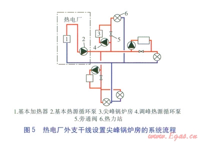 熱電廠外支干線設(shè)置尖峰鍋爐房(系統(tǒng)流程見圖5)。由圖5可知,與設(shè)置在熱電廠外主干線的峰荷熱源不同之處為尖峰鍋爐房設(shè)置在熱網(wǎng)的支干線上,尖峰鍋爐房負(fù)責(zé)某個分支的尖峰熱負(fù)荷。尖峰鍋爐房可以新建,也可以利用原有小區(qū)的供熱鍋爐房。對于這種設(shè)置方式,峰荷熱源的投資、運營方均為供熱公司。