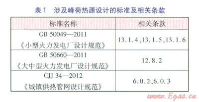 目前,涉及峰荷熱源設(shè)計的標(biāo)準(zhǔn)及相關(guān)條款見表1。針對小型火力發(fā)電廠,GB 50049-201113.1.4條、l3.1.5條、l3.1.6條,對熱化系數(shù)、峰荷熱源設(shè)置方式進行了有關(guān)規(guī)定,但對峰荷熱源設(shè)置方式的規(guī)定不十分明確具體,使得設(shè)計人員在執(zhí)行中的自行處理和可選擇性余量過大。針對大中型火力發(fā)電廠,GB 50660-2011只在第12.8.2條規(guī)定:熱網(wǎng)尖峰加熱器應(yīng)根據(jù)熱負(fù)荷性質(zhì)、輸送距離、當(dāng)?shù)貧夂蚝蜔峋W(wǎng)系統(tǒng)等因素綜合研究確定是否裝設(shè)。并未考慮其他峰荷熱源形式以及尖峰加熱器所需抽汽對發(fā)電量的影響。CJJ 34-20126.0.2條、6.0.3條僅涉及了基本熱源與峰荷熱源的運行調(diào)節(jié)方式。