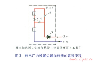 熱電廠內(nèi)設(shè)置尖峰加熱器(系統(tǒng)流程見圖3)。由圖3可知,當(dāng)供暖期處于初末寒期時,閥門4開啟,閥門5、6關(guān)閉,尖峰加熱器不投入運行。當(dāng)進入嚴(yán)寒期時,閥門4關(guān)閉,閥門5、6開啟,尖峰加熱器投入運行。雖然采用尖峰加熱器作為峰荷熱源的造價較低且易于實現(xiàn),但尖峰加熱器需較高參數(shù)的蒸汽,對發(fā)電量有一定影響。對于這種設(shè)置方式,峰荷熱源的投資、運營方均為熱電廠。