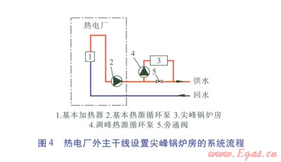 熱電廠外主干線設(shè)置尖峰鍋爐房(系統(tǒng)流程見圖4)。由圖4可知,熱水經(jīng)過熱電廠內(nèi)基本加熱器加熱后進入熱網(wǎng)主干線。當(dāng)供暖期處于初末寒期時,旁通閥開啟,尖峰鍋爐房不投入運行。當(dāng)進入嚴(yán)寒期時,旁通閥關(guān)閉,熱電廠出水經(jīng)尖峰鍋爐房加熱至設(shè)計溫度。對于這種設(shè)置方式,峰荷熱源的投資、運營方均為供熱公司。