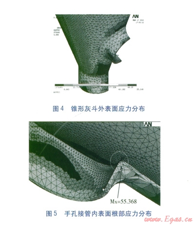 ANSYS提供了變形、應(yīng)力、應(yīng)變、能量等云圖顯示。錐形灰斗外表面應(yīng)力分布見圖4。手孔接管內(nèi)表面根部應(yīng)力分布見圖5。由圖4、5可知,最大當(dāng)量應(yīng)力位于手孔接管內(nèi)側(cè)的圓角過渡處,在設(shè)計(jì)壓力為0.28MPa時(shí),最大當(dāng)量應(yīng)力為55.37MPa。