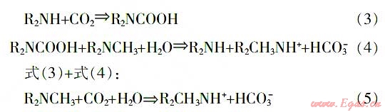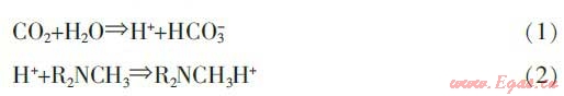 混合胺溶劑可以彌補大量脫除CO2時MDEA溶液的不足。純MDEA溶液與CO2不發(fā)生反應(yīng),但其水溶液與CO2可按式(1)~(2)反應(yīng):