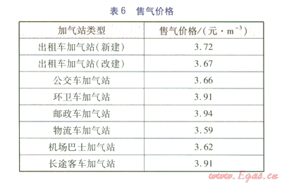 目標(biāo)收益率設(shè)定為項(xiàng)目資本金內(nèi)部收益率為12%,測(cè)算各類(lèi)加氣站的售氣價(jià)格,見(jiàn)表6。由表6可知,物流車(chē)、機(jī)場(chǎng)巴士、公交車(chē)、出租車(chē)等加氣站的售氣價(jià)格較低,更有市場(chǎng)吸引力。