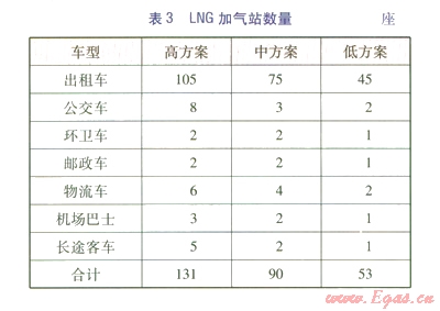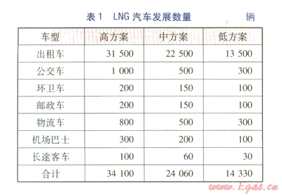 預(yù)測(cè)LNG長(zhǎng)途客車(chē)的發(fā)展為高方案100輛、中方案60輛、低方案30輛。按日加氣l