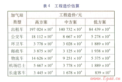 根據(jù)LNG車(chē)輛用戶(hù)的特點(diǎn)及北京市的實(shí)際情況確定加氣站的建設(shè),郵政車(chē)、物流車(chē)以及50%出租車(chē)的加氣站采用與規(guī)劃的加油站建合建站,分別進(jìn)行管理;公交車(chē)、環(huán)衛(wèi)車(chē)、機(jī)場(chǎng)巴士、長(zhǎng)途客車(chē)以及50%出租車(chē)的加氣站考慮改造有條件的已建加油站進(jìn)行聯(lián)合建站。各方案的工程造價(jià)估算見(jiàn)表4。