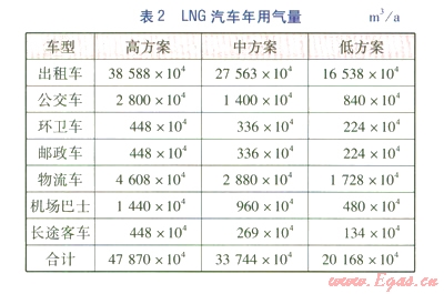 根據(jù)各類(lèi)LNG車(chē)輛潛在用戶(hù)的特點(diǎn),對(duì)各類(lèi)LNG汽車(chē)發(fā)展數(shù)量及年用氣量進(jìn)行了高、中、低3種方案的預(yù)測(cè),分別見(jiàn)表1、2。