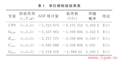 表1中,檢驗類型(c,T,d)分別代表所檢驗的序列中含有截距、時間趨勢以及滯后階數(shù);按AIC準則確定滯后階數(shù)。結(jié)果表明,CPI、GGDP、Eprice、Cprice、Gprice的水平值都是非平穩(wěn)的,但其一階差分是平穩(wěn)的(ADF檢驗即增廣迪基-福勒檢驗,其統(tǒng)計量的絕對值大于臨界值的絕對值,表示變量平穩(wěn)),因此,這5個變量序列都是在95%置信水平下的一階單整序列[表