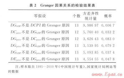天然氣價格波動DGprice是國內(nèi)生產(chǎn)總值增長率變動DGGDP的Granger原因,即天然氣價格變動將會影響國內(nèi)生產(chǎn)總值增長率。天然氣價格增長對國內(nèi)生產(chǎn)總值的影響主要體現(xiàn)在:我國天然氣產(chǎn)業(yè)進入快速發(fā)展階段,目前已累計建成天然氣主干管線約5×104km;產(chǎn)量連續(xù)多年保持兩位數(shù)增長,2011年超過1 000×