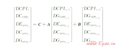依據(jù)上節(jié)選定的變量DCPI、DGGDP、DEprice、DCprice、DGprice構(gòu)建5維向量自回歸模型。通過模型滯后結(jié)構(gòu)確定準則,判定VAR模型的滯后期為2,建立VAR(2)模型如下:
