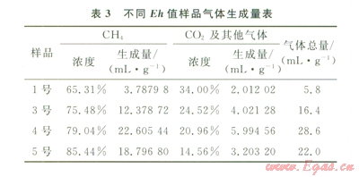 筆者在實(shí)驗(yàn)室條件下模擬了不同Eh條件下生物甲烷生成的情況,對(duì)不同條件下產(chǎn)出的氣體及甲烷含量進(jìn)行分析,并對(duì)甲烷在不同反應(yīng)階段的生成方式進(jìn)行了探討,實(shí)驗(yàn)結(jié)果表明: