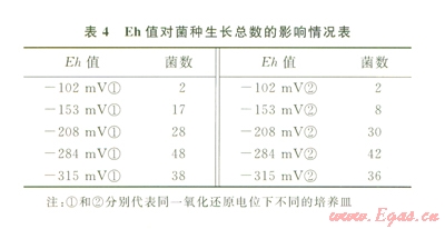 3)Eh值對(duì)菌種總量的影響。實(shí)驗(yàn)結(jié)束后對(duì)反應(yīng)瓶中的細(xì)菌進(jìn)行接種培養(yǎng),并采用活菌計(jì)數(shù)法對(duì)菌種量進(jìn)行計(jì)數(shù)得出表4。