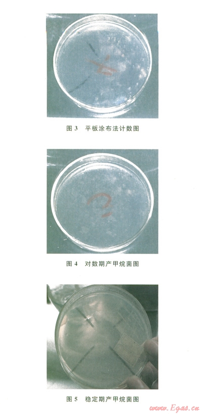 從接種培養(yǎng)的結(jié)果可以看出,細(xì)菌的生長(zhǎng)個(gè)數(shù)與氧化還原電位有一定的關(guān)系,在高氧化還原電位時(shí)產(chǎn)甲烷菌的數(shù)量較少,隨著氧化還原電位的降低,基本趨勢(shì)是細(xì)菌生長(zhǎng)的個(gè)數(shù)越來越多。由此認(rèn)為,氧化還原電位是產(chǎn)甲烷發(fā)酵的重要限制因子,較低的適合的氧化還原電位可以促進(jìn)產(chǎn)甲烷菌體內(nèi)的酶系的活性,使其調(diào)整代謝方式和速率,加快生長(zhǎng)繁殖。另對(duì)-284mV的氧化還原電位值的產(chǎn)甲烷菌進(jìn)行為期90d的培養(yǎng)觀察,菌種的平板培養(yǎng)結(jié)果如圖3~5所示。