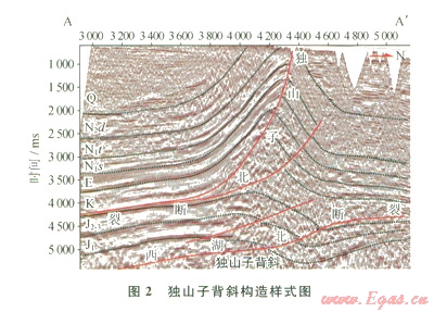 2顯示了獨(dú)山子北斷裂沿白堊系吐谷魯群泥巖層滑脫,向上突破進(jìn)入古近系地層,控制了獨(dú)山子背斜斷層傳播褶皺的發(fā)育。獨(dú)山子背斜中淺層為典型的斷層傳播褶皺。其特點(diǎn)為:①背斜后翼模擬下盤斷坡產(chǎn)狀;②形成向斷層運(yùn)動(dòng)方向傾倒的不對(duì)稱背斜;③常有突破斷層發(fā)育;④突破斷層位移量很小[4]。