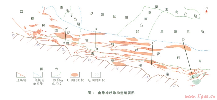 從構(gòu)造演化角度看,下組合構(gòu)造定型相對(duì)較早,貼近烴源層,圈閉多、面積大(1),勘探程度低,與中上組合比構(gòu)造相對(duì)寬緩,勘探領(lǐng)域廣闊,是尋找規(guī)模儲(chǔ)量的重要勘探領(lǐng)域[9]。南緣下部成藏組合主要發(fā)育斷層轉(zhuǎn)折褶皺與構(gòu)造三角楔2種構(gòu)造樣式:前者構(gòu)造變形弱.圈閉落實(shí)程度高,是南緣下組合下一步鉆探的首選目標(biāo);后者主要發(fā)育在第二排背斜構(gòu)造帶(霍瑪吐背斜)上,構(gòu)造變形強(qiáng),圈閉落實(shí)程度低,是地震攻關(guān)的重點(diǎn)目標(biāo)。