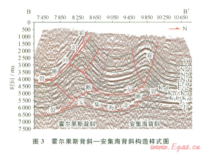 南緣沖斷帶霍、瑪、吐構(gòu)造深層發(fā)育三角楔構(gòu)造。圖3為過霍爾果斯與安集海背斜的一條區(qū)域剖面。霍爾果斯背斜深部的構(gòu)造三角楔由霍安斷裂與一個(gè)反向沖斷層組成。沿中下侏羅統(tǒng)發(fā)育的滑脫斷層向上突破白堊系,再沿白堊系滑脫,前鋒向上突破控制了北部安集海背斜中淺層背斜特征?;舭矓嗔言诨魻柟贡承毕蛏贤黄瓢讏紫档倪^程中(前沖斷層),同時(shí)伴生一個(gè)反向的沖斷層(反沖斷層),形成霍爾果斯背斜深部構(gòu)造三角楔??梢钥闯鰳?gòu)造三角楔前端向斜軸面位置與三角楔前緣端點(diǎn)位置一致,符合構(gòu)造三角楔幾何變形原理。